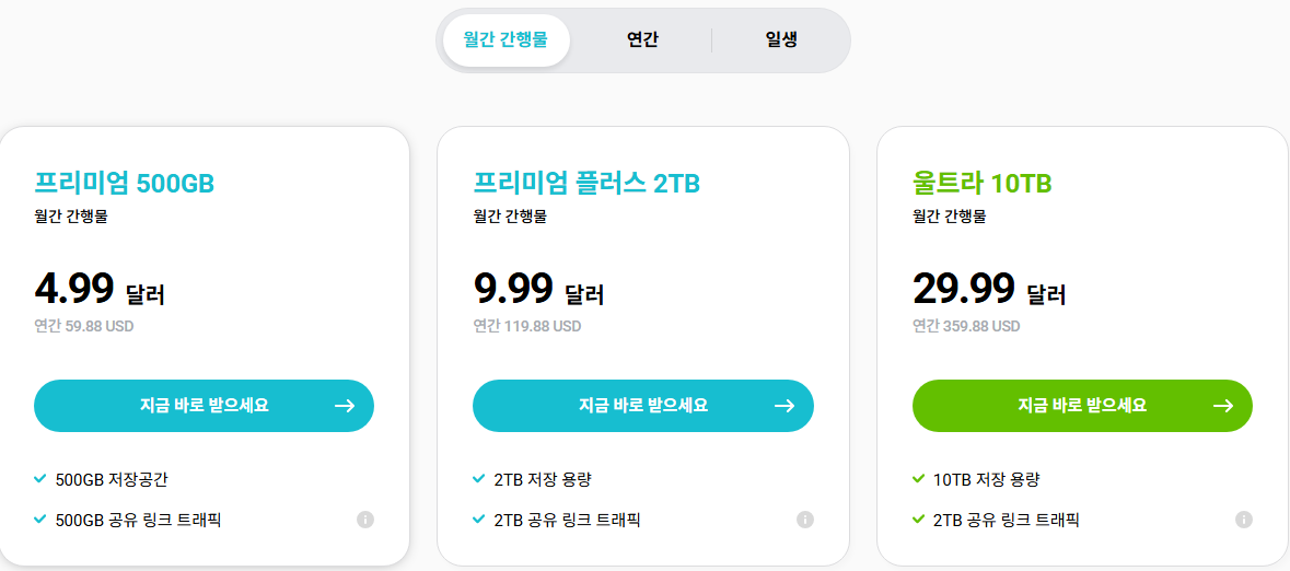 pCloud는 구독형 요금제뿐 아니라 평생 이용권 옵션도 제공합니다.